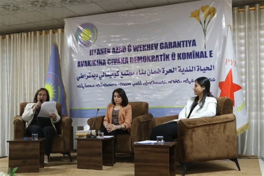 كما اعتبر المشاركون أن تطبيق نظام الكومينات هو السبيل العملي لبناء حياة مشتركة متوازنة، تنهي احتكار السلطة وتعيد توزيعها بشكل ديمقراطي بين النساء والرجال.