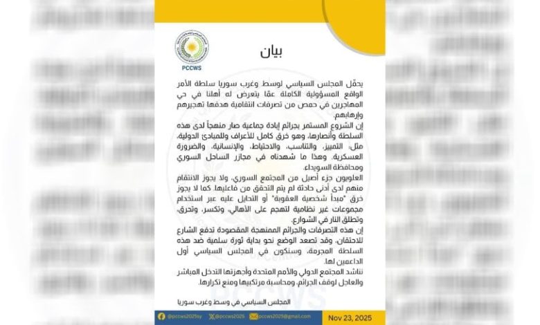 وأشار المجلس إلى أن “الأهالي العلويين جزء أصيل من المجتمع السوري، مؤكداً أنه لا يجوز الانتقام منهم دون التحقق من المسؤولين عن أي حادثة، أو التحايل على مبدأ شخصية العقوبة من خلال استخدام مجموعات غير نظامية لتنفيذ أعمال عنف وتخريب”.