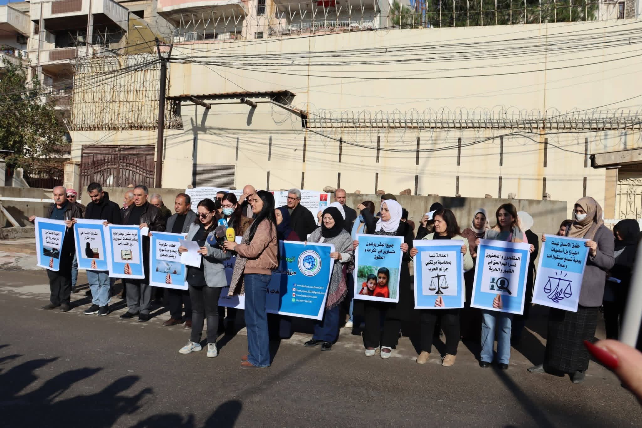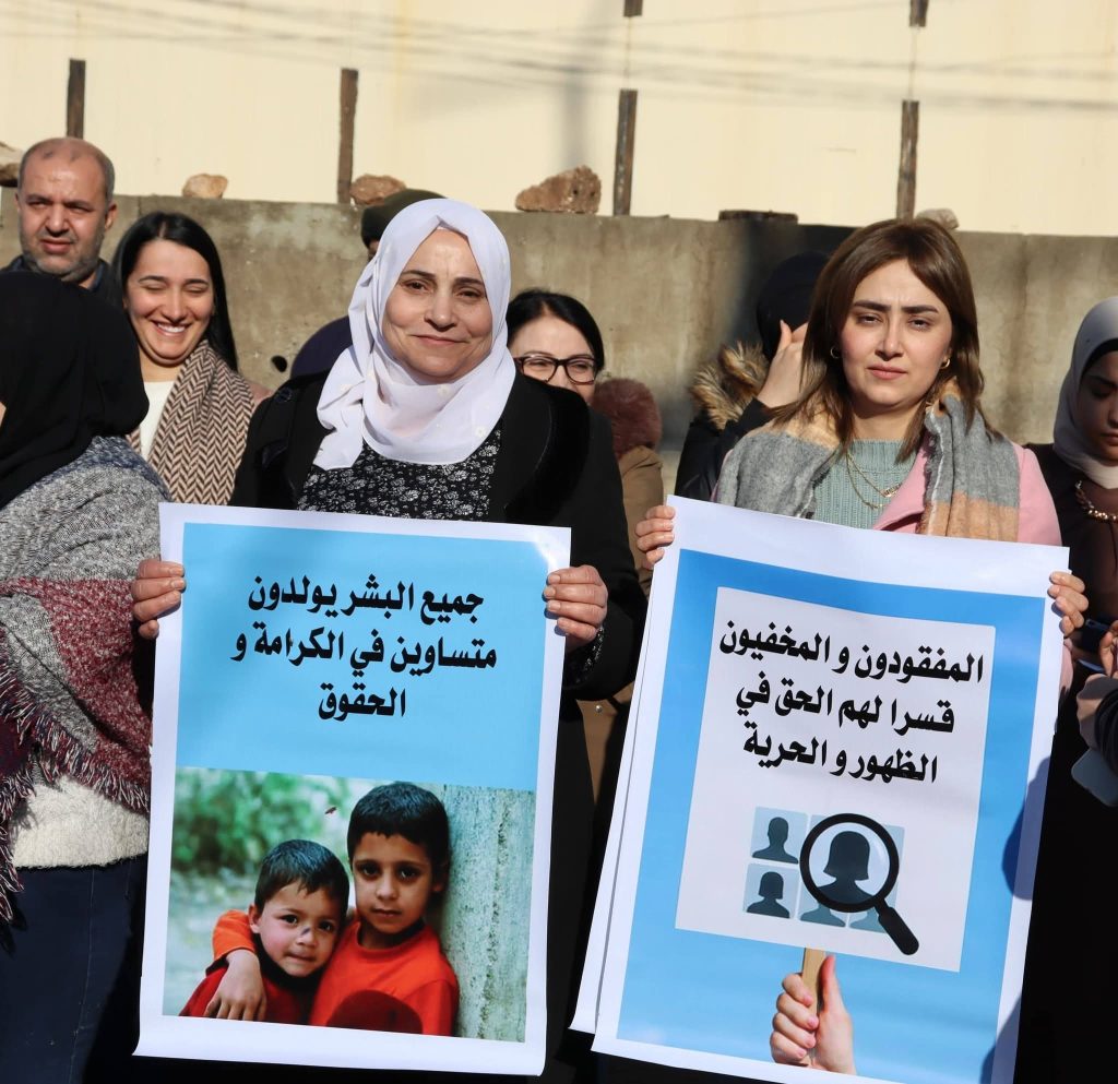 ورفع المشاركون لافتات تطالب بـ “العودة الآمنة حق لكل مهجّر ولاجئ بضمانات دولية” و”العدالة تبدأ بمحاسبة مرتكبي جرائم الحرب” و”المفقودون والمخفيون قسراً لهم الحق في الظهور والحرية”.